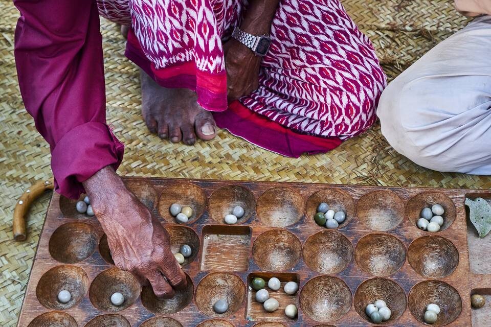 Даже в пирамиде Хеопса нашли такую «доску» с игровым полем. Это самый долгий в своей непрерывности путь игры - в нее играют до сих пор. Играя, нужно занять лунку, дающую право отобрать камни у соперника, и в итоге скопить у себя больше камешков. Более всего она была популярна у кочевых народов в силу даже не мобильности, а повсеместности игрового снаряжения: для нее достаточно выкопать в земле дюжину лунок, взять горсть камушков, скатанных кусочков глины, бобов, орехов, зерен и можно играть. В современной западной Африке эта игра зовется оуа и овари, у казахов и киргизов — тогызкумалак, а у индийцев — паллантуджи и олинда келия. В Германии детский вариант игры продаётся под названием Apfelklau («Укради яблоко»), в СССР она называлась калах (от названия игры ведущих караваны по пустыне Калахари). Названий множество, число рядов, лунок и камней варьируется, но основные принципы схожи.