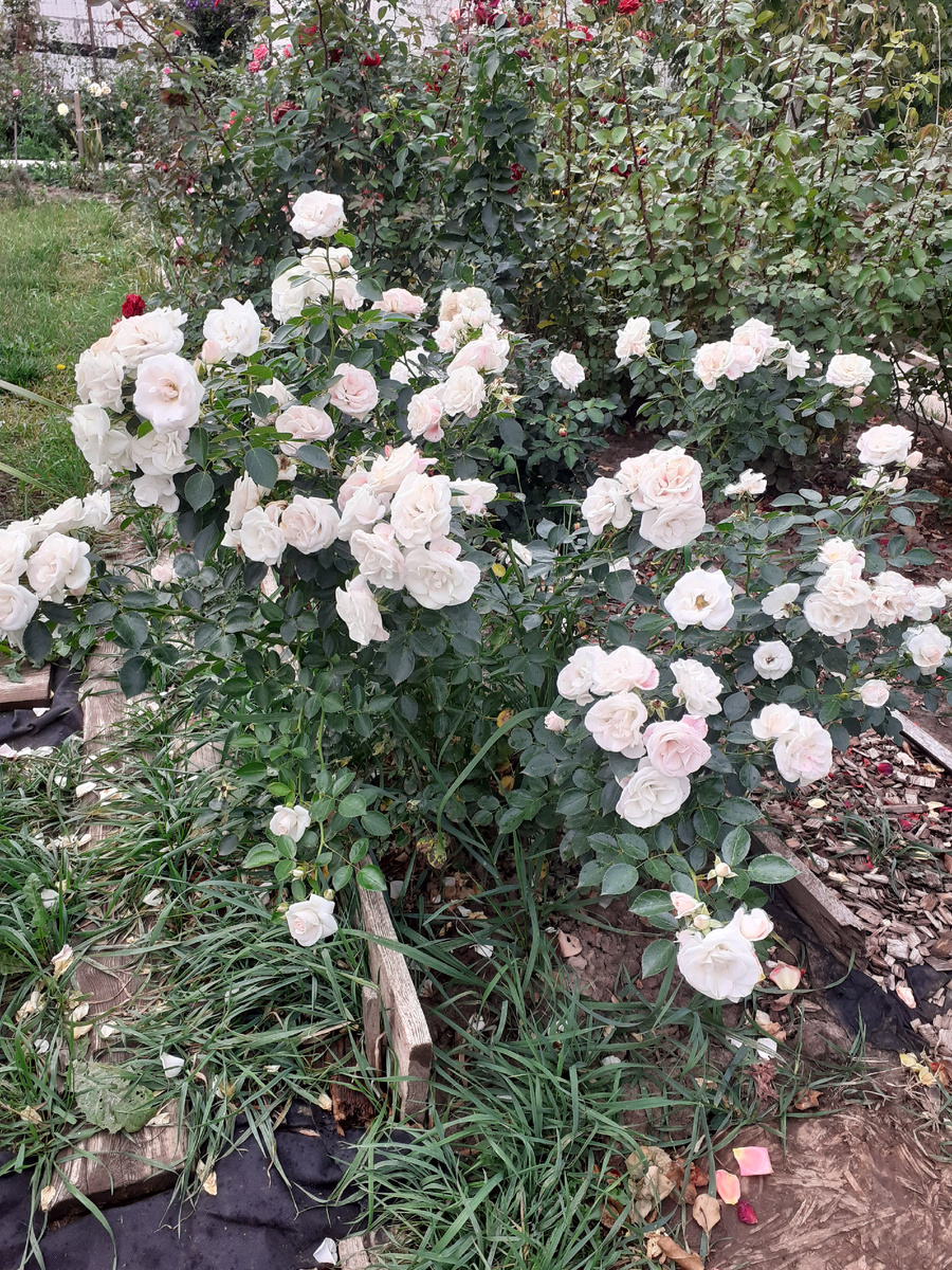 Порадовал нынешний сентябрь погодой, что и говорить... Да и вообще лето было не плохим - дождей в меру, жары - тоже. Идеальная погода для выращивания роз. Хотя первое цветение, я бы сказала, прошло в обычные сроки несмотря на раннюю весну. Я применяю сухое укрытие роз на зиму. Это значит 2 слоя толстого агроспана и поверх - непромокаемый материал, например, укрывная плёнка или "сахарные " мешки, если каждая роза укрывается индивидуально. Под таким укрытием весной розы рано идут в рост и поэтому я их обычно открываю пораньше, чтобы рост задержать и потом молодые побеги не попали под заморозки. Вызревшие же стебли спокойно переносят весенние заморозки. Так сделала и в этом году. Весна была хоть и ранней, но не слишком тёплой и молодые побеги не спешили идти в рост. Первое цветение, как обычно у нас, пришлось на июль, а какие то сорта успели зацвести в конце июня. А к осени молодой куст Аспирин разросся и второе его цветение представлено на аватарке статьи. Уже октябрь, а цветы и не думаю