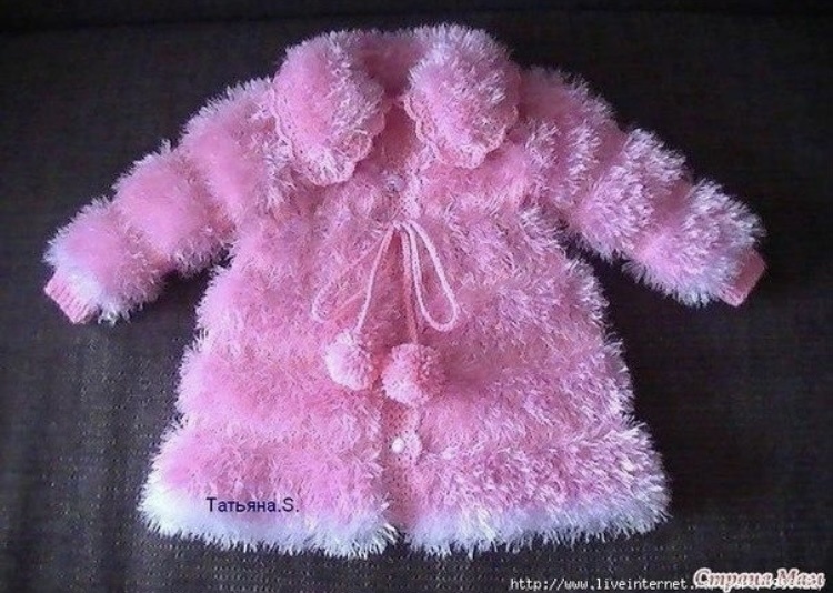 Друзья! Пальто вяжется спицами и смотрится эффектно, при том, что связано оно обычными лицевыми петлями. На такое пальто уходит три с половиной 100 граммовых мотка травки по 150 м. и два шерстяной по 130 м. "Я не делаю никакой выкройки! На возраст два года набираю 230 петель(можно и 250 кому как понравится)травкой, пальто вяжется одним полотном до линии пройм! После набора петель связать 20 рядов травой, затем переходим на обычную нить и равномерно сбавить в одном ряду 20 петель и связать 8 рядов(на спицах 210 петель), затем пять вяжем травой, так же в первом ряду сделать равномерное убавление 10 петель, связать 14 рядов! Таким образом чередовать полосы до нужной длинны и пока на спицах не останется 120 петель (если в последней полосе будет больше чем 120, сделать побольше сбавлений подогнав до нужного количества)Дальше делим полотно на полочки и спинку, вязать всё по отдельности начиная с полочки-30петель, развернуть работу, закрыть 5 петель про проймы. связать 10 см. лицевой гладью