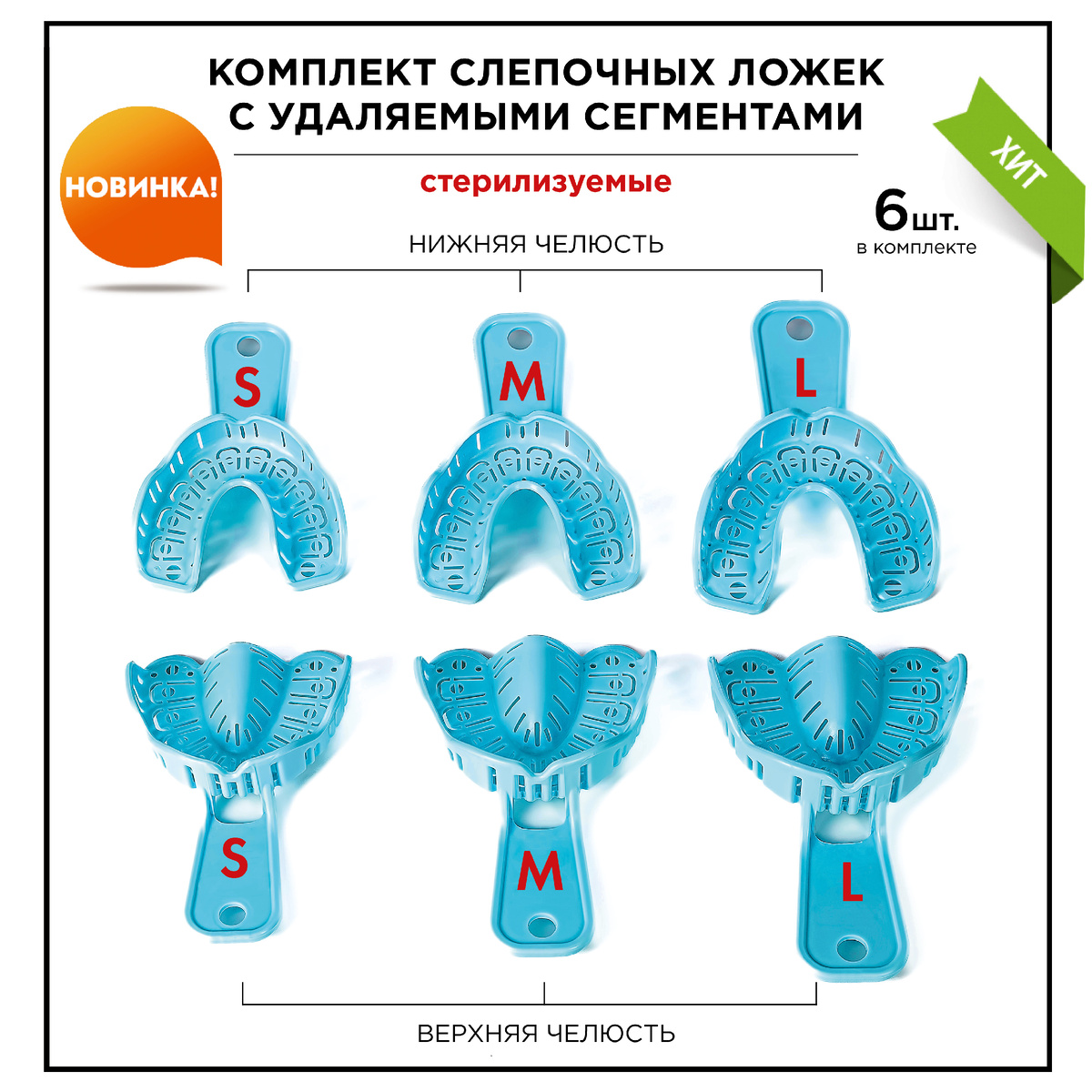 СТЕРИЛИЗУЕМЫЕ СЛЕПОЧНЫЕ ЛОЖКИ ДЛЯ ИМПЛАНТОВ С УДАЛЯЕМЫМИ СЕГМЕНТАМИ: Комплект из 6 штук (размеры S, M, L - на обе челюсти).