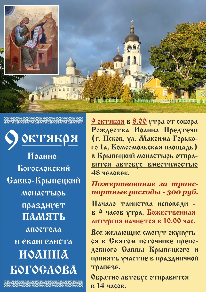 Божественная Литургия – 10:00. По окончании богослужения всех ждет праздничная трапеза. Также желающие смогут окунуться в святом источнике преподобного Саввы Крыпецкого. Для удобства паломников в этот день от собора Рождества Иоанна Предтечи на подворье Иоанно-Богословского Савво-Крыпецкого монастыря в городе Пскове (ул. Максима Горького, 1а) в святую обитель отправится автобус вместимостью 48 человек. Отправление – в 8:00. Пожертвование на транспортные расходы – 300 рублей. Обратно в город автобус отправится в 14:00.