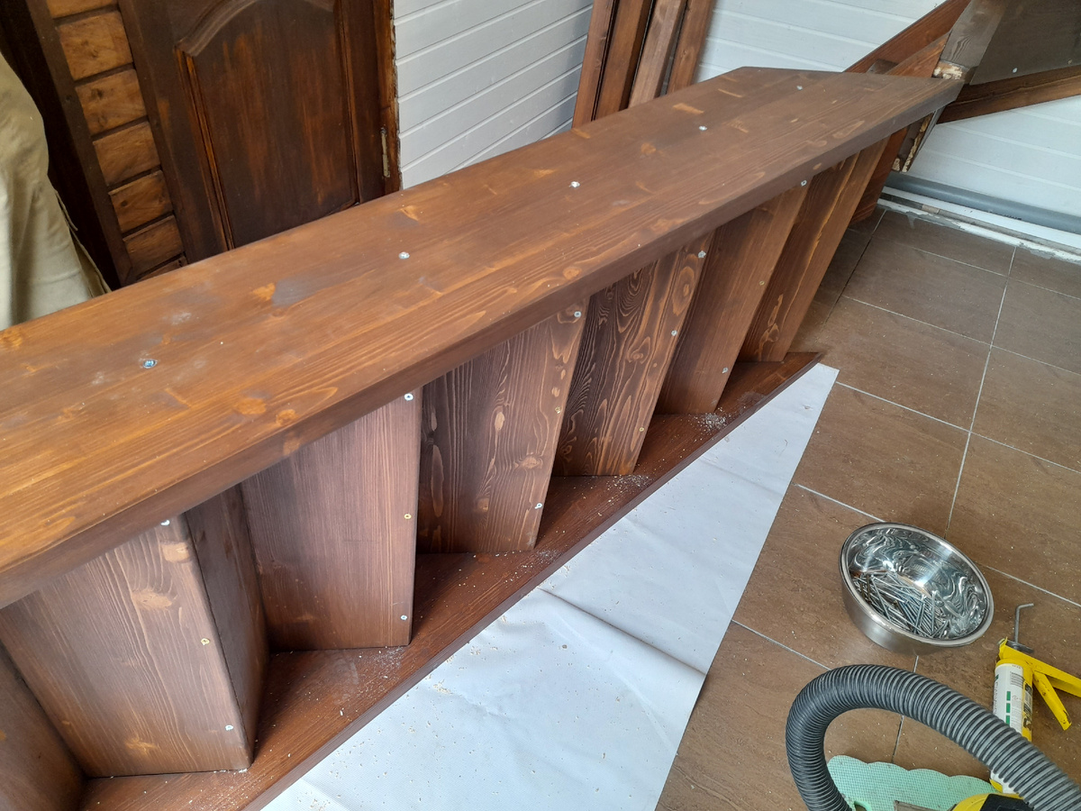 Напомню, что лестницу на второй этаж мы купили готовую. Перед установкой покрыли ее тонирующим антисептиком и начали собирать. Собирали блоками. Все понятно даже без инструкции. Примеряли детали, места стыков по рекомендации производителя промазывали прозрачным силиконом, а потом стягивали саморезами. Силикон должен избавить нас от скрипа. Отверстий для саморезов не было, сверлили сами. Когда начали собирать все в единую конструкцию выяснилось, что лестница не подходит нам по высоте. Не хватает 21 см, а это практически еще одна ступень. Я примерно прикидывала, что такое возможно. Готовую вещь всегда труднее встроить в свое пространство. Хорошо что на Озон есть отзывы. Люди, ранее купившие эту лестницу, уже сталкивались с такой проблемой и нашли решение. По тому же пути пойдем и мы. Сделаем еще одну дополнительную ступеньку. Для этого нужны мебельные щиты. С щитами обещал помочь знакомый. Набрали ему кусков толстой доски, а он их склеит и сделает нужного размера. А еще нужно будет увели