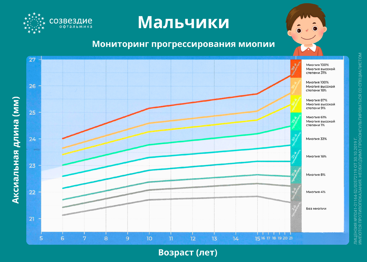 Для работы с процентильными диаграммами мы используем два параметра: значение длины глаза и возраст вашего ребенка. Измерения проводятся на высокоточном приборе Биометр ZEISS IOLMaster 500 (Германия) – одного из лучших в своем классе. Оценка на графике.