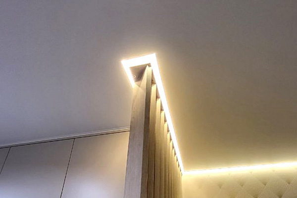 Во время установки натяжного потолка также производится монтаж осветительных приборов — люстр, встроенных светильников или светодиодных лент. Специалисты заранее проделывают отверстия в полотне для светильников, укрепляют их специальными термокольцами и подсоединяют проводку. - Финальная натяжка и проверка