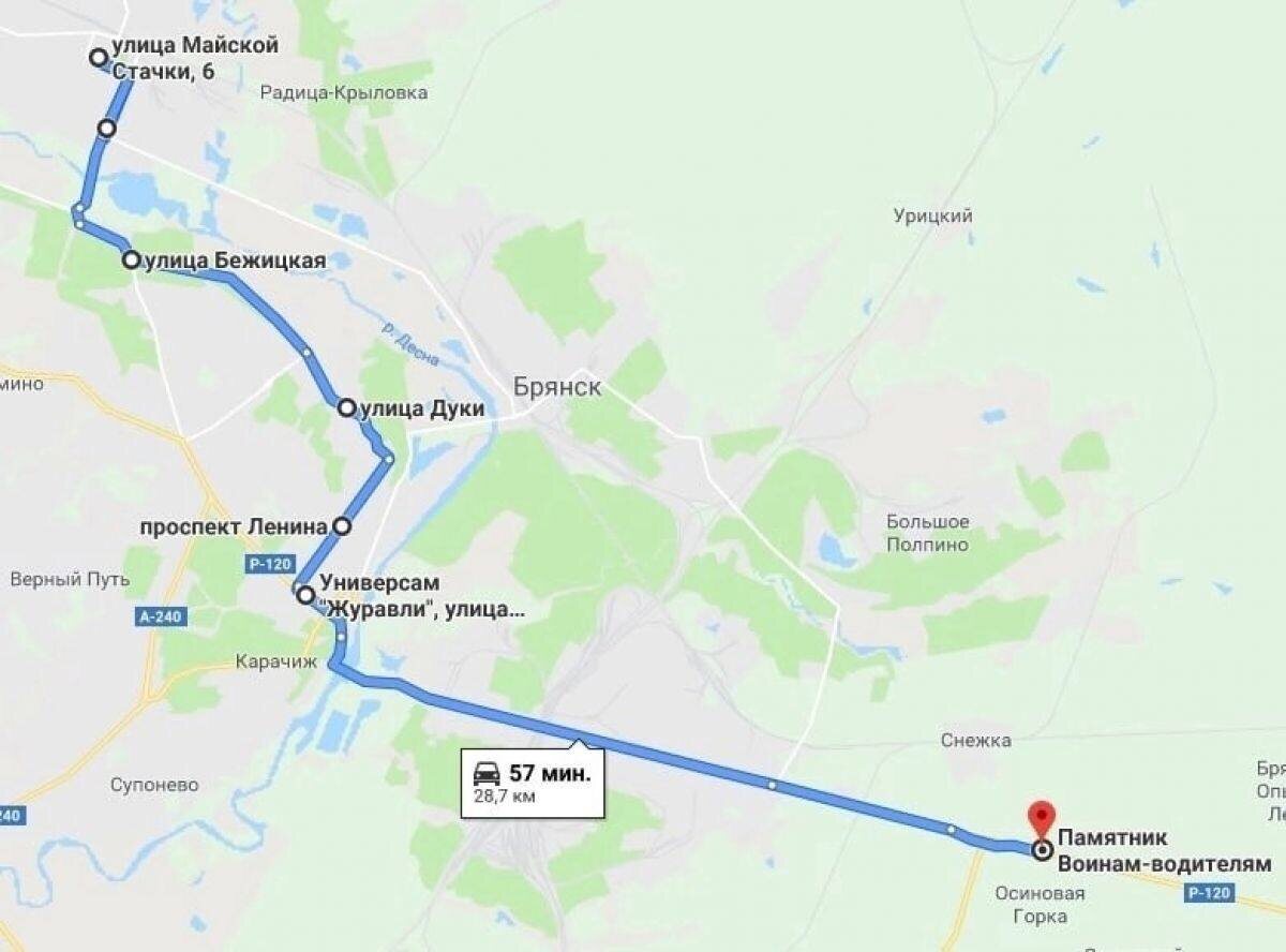 Байкеры планируют доехать до памятника водителям по следующему маршруту: ДК БМЗ - ул. Комсомольская - ул. Ульянова - ул. Бежицкая - ул. Дуки - пр-т. Ленина - ул. Красноармейская - ул. Калинина - пр-т Московский. https://bryansknovosti.ru/?p=398968