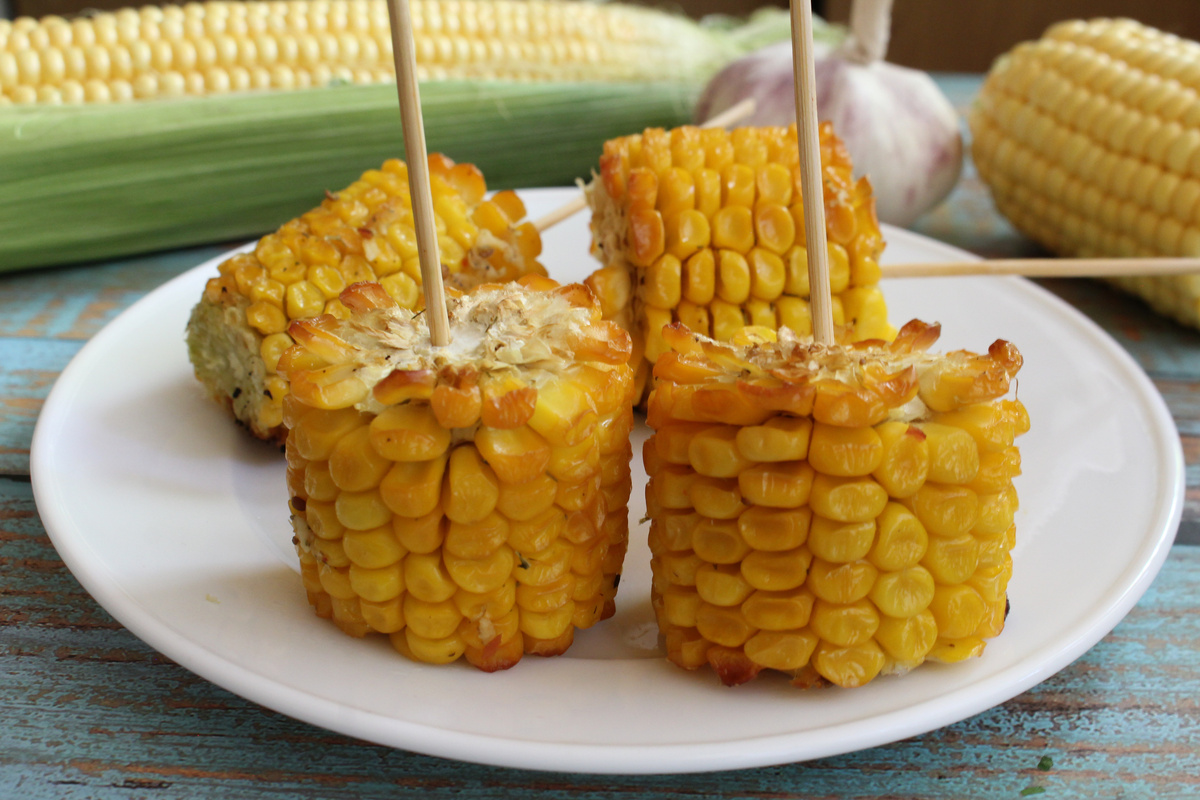 Если вы любите кукурузу, то ее можно не варить, а запечь в духовке и будет очень вкусно. Вкусно и без особых хлопот. Такая кукуруза получается мягкая, сочная и невероятно ароматная. Пряности, специи, количество чеснока можно менять по своему вкусу, сделать кукурузу более соленой или менее, добавить чеснока больше или совсем не добавлять. Можно использовать и другие любимые пряности, зелень. Все варианты надо попробовать. Кукуруза - 2-5 шт. Чеснок - 1-3 зуб. Хмели-сунели - 0.3 ч.л. Соль - 0.3 ч.л. Масло сливочное - 30-50 г. Вода - 150 мл. Кукурузу можно запечь целиком, можно нарезать. Я нарезала кукурузу на удобные кусочки. Выложим кукурузу в рукав, добавим воду, чеснок продавим через пресс. Добавим в рукав хмели-сунели, соль. Добавим в рукав сливочное масло. Рукав завязываем, делаем сверху небольшой разрез для выхода пара. Отправляем рукав в духовку, запекаем кукурузу до мягкости при температуре 180С. В готовую кукурузу вставляем шпажки для удобства, но это по желанию. Всем вкусной жиз