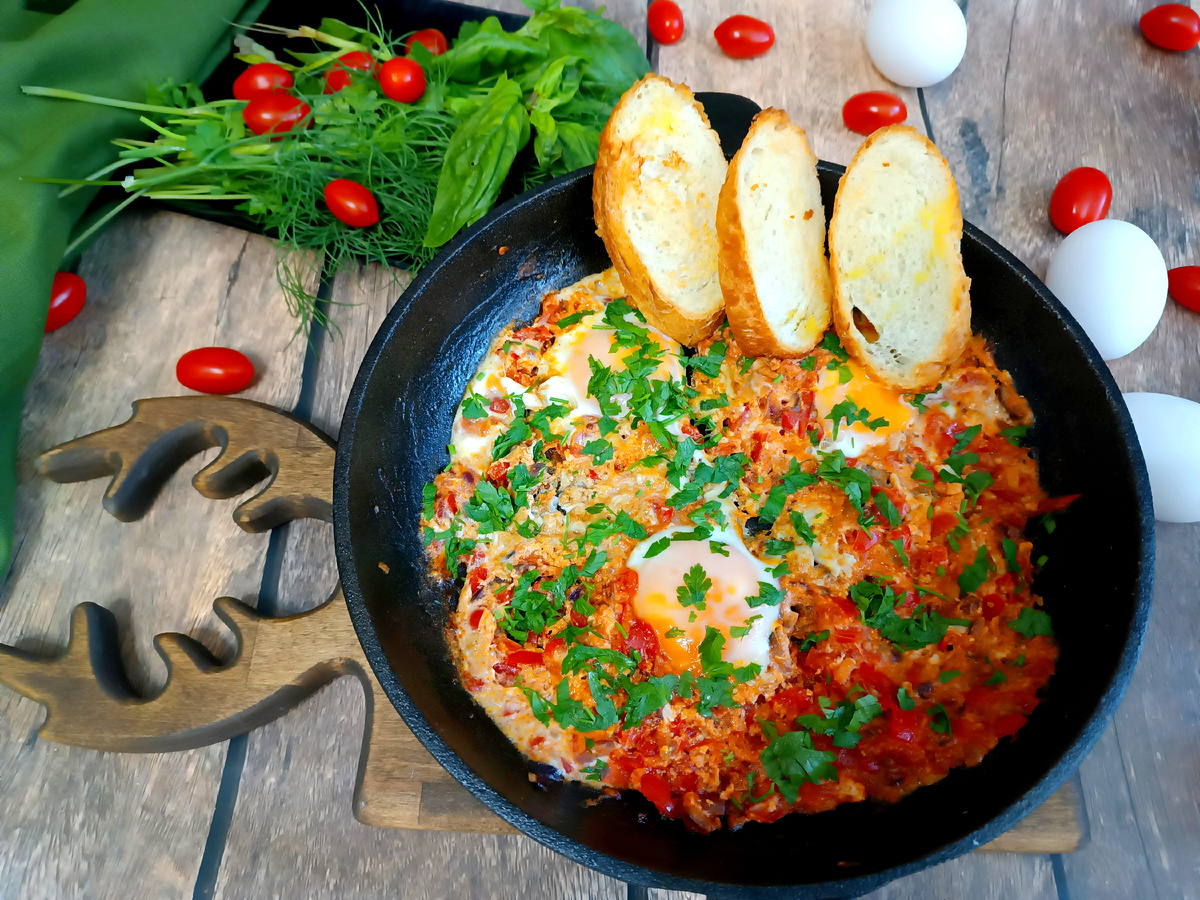 Точное происхождение шакшуки неизвестно,но считается,что у неё ближневосточные корни. Слово " шакшука" произошло от арабского слова,означающего "смесь",что отражает сочетание ингредиентов блюда. Сейчас шакшуку едят и готовят по всему миру, и в каждой стране своя история происхождения этого блюда Это классический способ приготовления шакшуки,но на самом деле нет ограничений на различные виды овощей,которые вы можете положить в соус. Для примера,можно добавить: Конечно шакшуку можно подавать не только на завтрак, но и на обед и даже ужин с хрустящим хлебом. Важно: быстро,вкусно,сытно. Лук репчатый - 1/2 средней луковицы Чеснок - 1-2 зубчика Болгарский перец(красный) - 1 шт Помидоры - 3 шт. Томатная паста - 2 ст.л. Масло оливковое - 2 ст.л. Кориандр,зира,тмин,перец Чили - по вкусу Соль,сахар - по вкусу Зелень - по вкусу Шакшука будет тушиться до готовности яиц Если вы не любите жидкие желтки,то можно прикрыть крышкой. При подаче посыпать любимой зеленью и сыром по желанию Подавать с хр