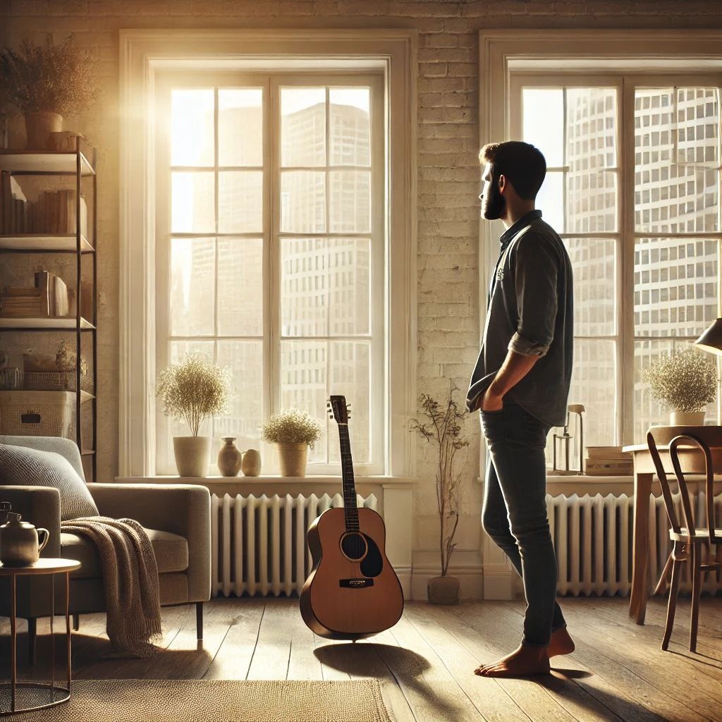Алекс смотрел в окно на серый, дождливый город. Капли стекали по стеклу, размывая очертания домов и деревьев. Где-то там, за этой пеленой, была жизнь, о которой он когда-то мечтал. Устало потерев глаза, он отвернулся от окна. В углу комнаты его внимание привлекла старая гитара, покрытая тонким слоем пыли. Алекс не мог точно вспомнить, когда в последний раз держал ее в руках. Может, пять лет назад? Или семь? Время, казалось, слилось в один бесконечный серый день. Он медленно подошел к инструменту, словно боясь спугнуть воспоминания. Пальцы, огрубевшие от работы в офисе, неуверенно коснулись струн. Тихий, расстроенный звон эхом отозвался в его душе, вызывая острое чувство тоски и сожаления. Он почувствовал, как к горлу подкатывает предательский ком. Сколько можно копаться в прошлом? Сколько можно мучить себя мыслями о несбывшемся? Неожиданный звонок в дверь вырвал его из пучины самобичевания. На пороге стояла соседка, Марина. В руках у нее был пакет с продуктами. Алекс хотел отказатьс