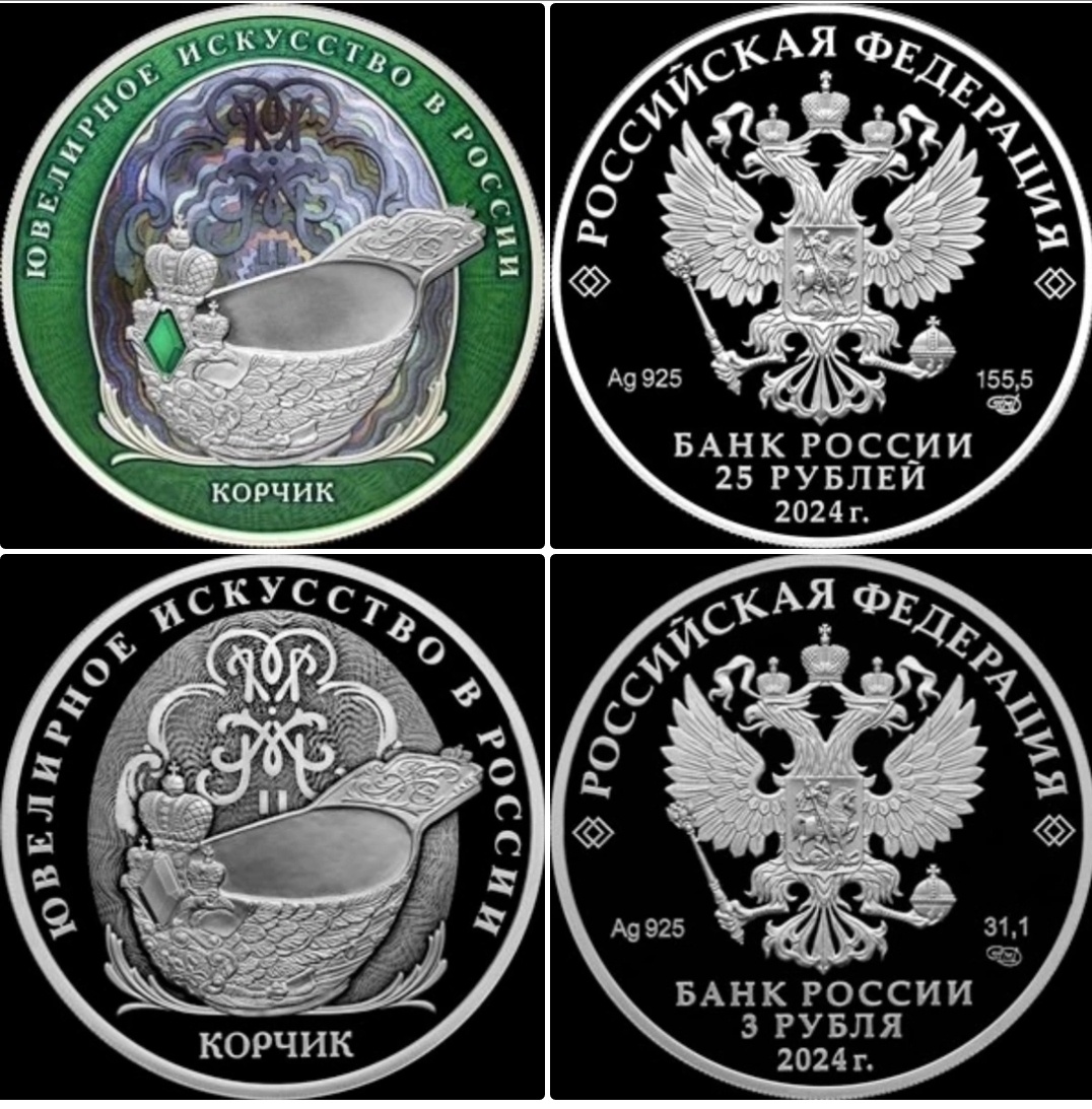 Ювелирное искусство в России 🇷🇺 Банк России 2 октября 2024 года выпускает в обращение памятные серебряные монеты «Корчик ювелирной фирмы «Фаберже» серии «Ювелирное искусство в России»: — номиналом 3 рубля, — номиналом 25 рублей, — номиналом 25 рублей с цветным покрытием. Серебряный корчик входил в коллекцию изделий Фаберже, предназначенных для официальных подарков к 300-летию династии Романовых. Заказ на их изготовление ювелирная фирма получила в 1913 году. Корчик по форме близок к традиционному русскому ковшу и напоминает образ водоплавающей птицы. В оформлении изделия большая роль отведена государственной символике России. Серебряные монеты номиналом 3 рубля (масса драгоценного металла в чистоте — 31,1 г, проба сплава — 925) и 25 рублей (масса драгоценного металла в чистоте — 155,5 г, проба сплава — 925) имеют форму круга диаметром 39,0 и 60,0 мм соответственно Монеты изготовлены качеством «пруф». Тираж монет: — номиналом 3 рубля — 3,0 тыс. штук; — номиналом 25 рублей — 0,