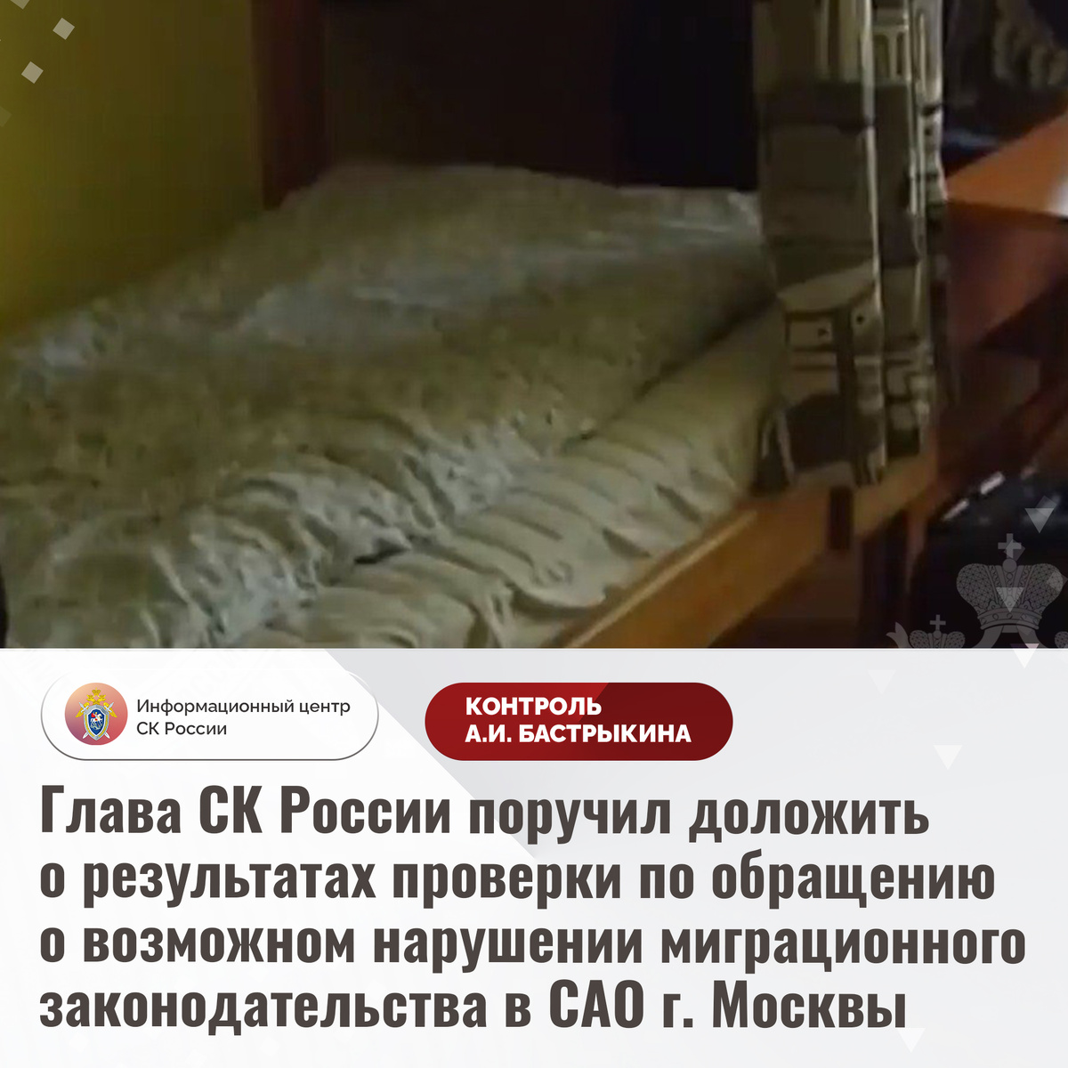 Глава СК России поручил доложить о результатах проверки по обращению о возможном нарушении миграционного законодательства в САО г. Москвы В комментариях в аккаунте Информационного центра СК России обратилась жительница города Москвы по вопросу возможного нарушения миграционного законодательства в Северном административном округе. На указанной территории функционирует большое количество хостелов, которые располагаются в подвальных помещениях домов, в том числе на Ленинградском проспекте. В гостиницах проживают мигранты, которые могут незаконно находиться на территории России. Многочисленные обращения в компетентные органы результатов не принесли. Указанная ситуация ранее освещалась в СМИ. В ГСУ СК России по городу Москве по доводам комментария начата процессуальная проверка. Председатель Следственного комитета Российской Федерации Александр Иванович Бастрыкин поручил руководителю ГСУ СК России по городу Москве Андрею Александровичу Стрижову доложить о предварительных и окончательных рез