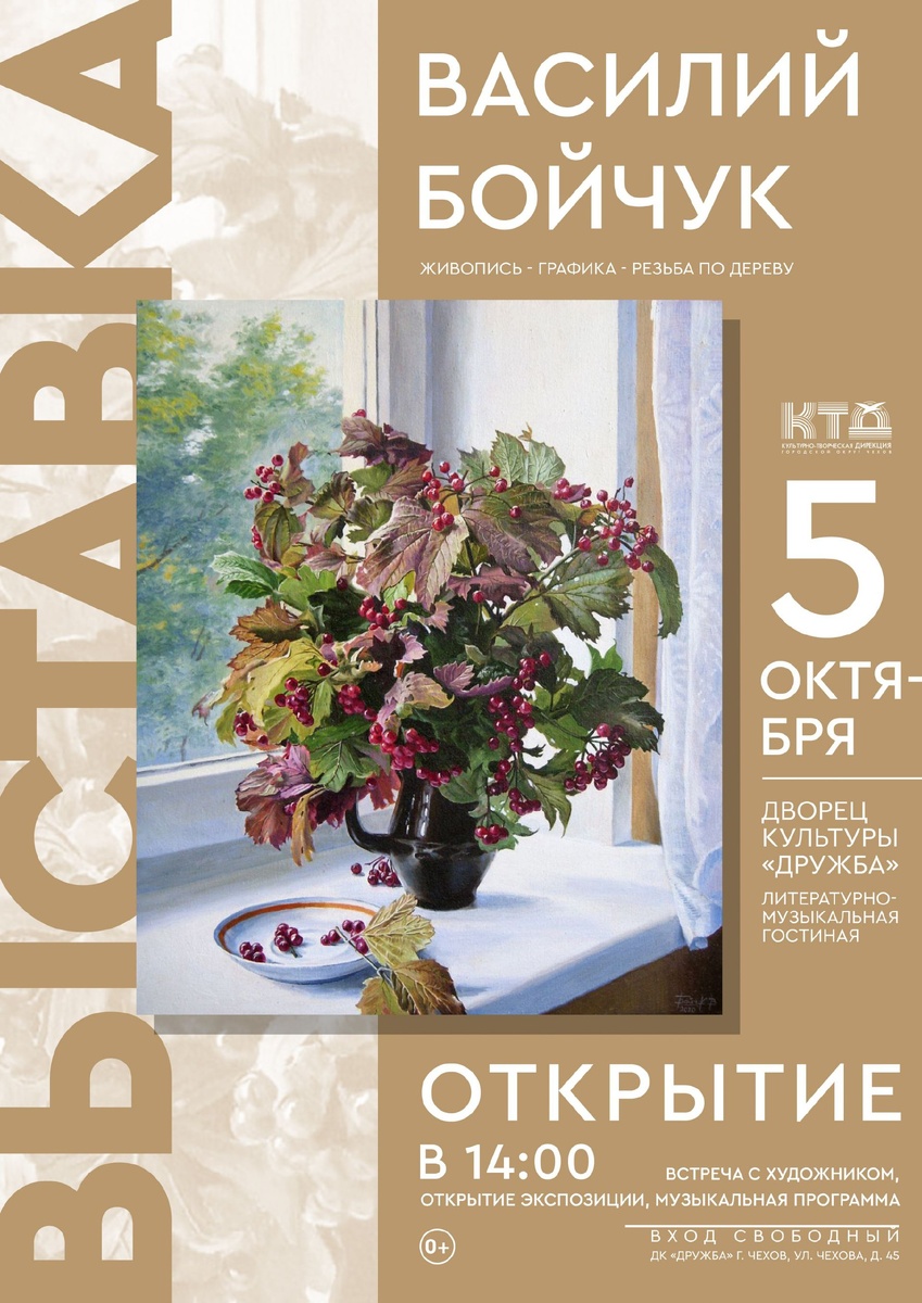 💥 ОТКРЫТИЕ персональной выставки чеховского художника Василия Бойчука 🏔️Василий Васильевич Бойчук много лет жил и работал на Севере, в местах глухих, таежных и необыкновенно красивых. На картинах художника того периода рассветы на таежных реках, осень и весна в северных лесах, долины и горы заповедника, не тронутых цивилизаций мест. 💫В последние годы художник живёт в Чехове и создал ряд картин, написанных подробно и с большой душевной теплотой посвящённых нашему городу. ❗У Василия Васильевича есть немало поклонников, которые с нетерпением ждут открытия его персональной выставки. 💗До встречи в Литературно-музыкальной гостиной 5 октября. 🚫 Возраст: 0+ 📆 05.10.2024 🕕 14:00 🏢 ДК «Дружба» 📍 г. Чехов, ул. Чехова, д.45 🪙 Стоимость билетов - Бесплатно❗️ #ДКДружба #КТД #ГоспабликиМО #ГородскойОкругЧехов