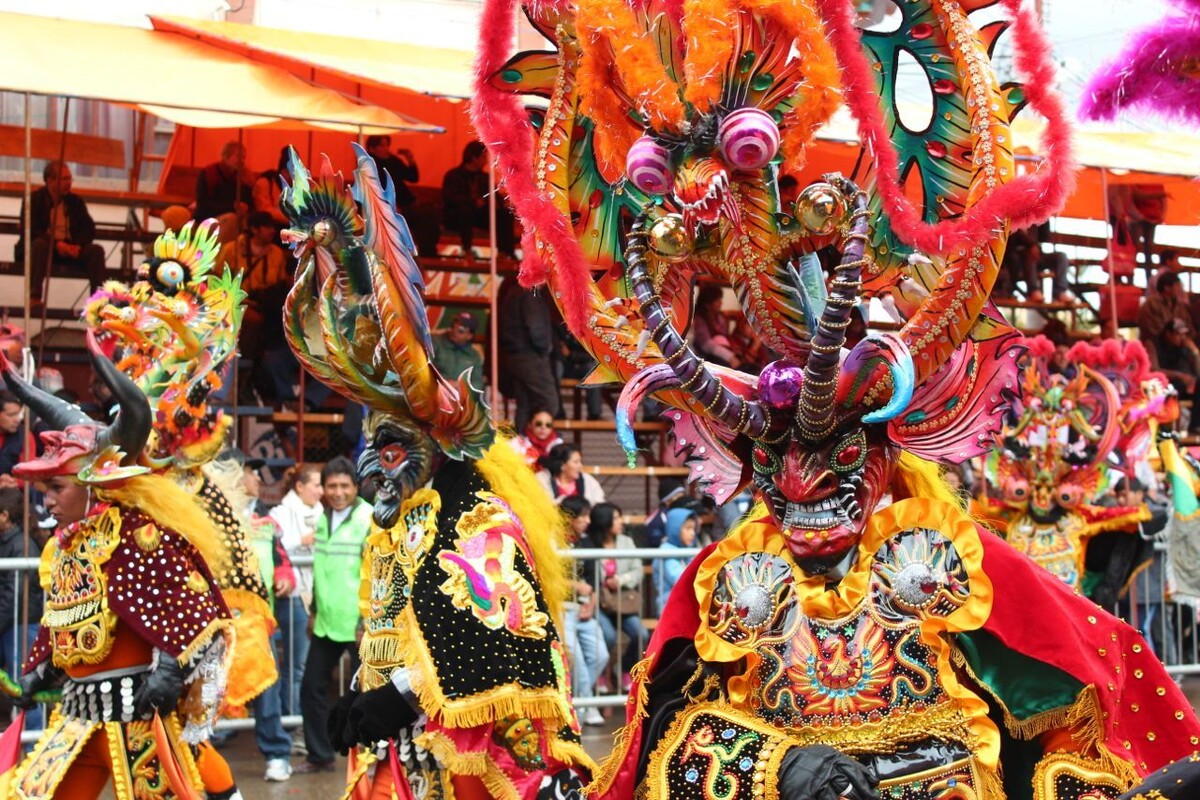Так, древний ритуал символизирующий благодарность Матере-земле или Деве Марии за спасение, превратился в традиционный боливийский карнавал, находящийся под защитой ЮНЕСКО как «устно-визуальное достояние человечества». Свое название он получил по имени главного праздничного танца – «танца дьявола», который исполнялся в рогатых масках и отражает противостояние добра и зла. Ежегодный карнавал начинается на закате зимы — за 8 дней до начала католического Великого поста. В это время сюда съезжаются жители со всей Боливии, около 30 тысяч танцоров и 10 тысяч музыкантов. За неделю до начала буйства участники идут в церковь Марии де Скавон и приносят торжественную клятву танцевать в ближайщие три года. Затем в пятницу, накануне карнавала, происходит ритуал очищения, когда Деву Марию переодевают на ближайший год и проводятся различные ритуалы. А уже с восьми утра следующего дня начинается сам карнавал.