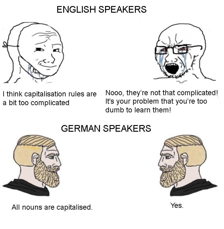 Как обычно, всё началось в средневековье. Вы пишете текст. Hans – это важно? Да, пишем с большой буквы. А Gott – важно? Очень важно! Капсом не напишем, но с большой буквы начать обязательно. А Mutter? Да, я уважаю свою мать, напишу с большой буквы. Liebe – столь светлое и важное чувство. С большой буквы! И вот внезапно все существительные уже пишутся с большой буквы. P.S. в смсках немцам очень часто плевать на это правило.