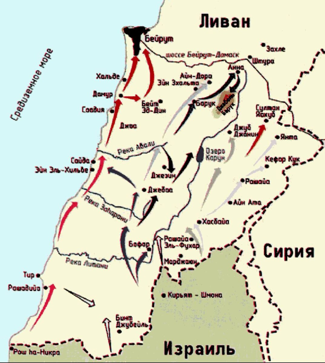 Внушительной группировкой численностью около восьмидесяти тысяч солдат, при поддержке 800 танков и более чем 600 самолётов, а также кораблей флота, 6 июня 1982 года израильская армия вторгается в Ливан. Палестинцы оказали ожесточённое сопротивление, но силы были слишком неравны. Ударной мощи ЦАХАЛ противостояло около 15 тысяч бойцов ООП при 80 танках и чуть более 20 тысяч сирийцев, имевших 352 танка и 450 самолётов. Стоит также учитывать техническое превосходство новейших танков «Меркава» над старенькими сирийскими Т-55. Тем не менее, сирийская армия дала несколько достойных и кровопролитных боёв израильтянам в центре страны, где ЦАХАЛ понёс большие потери и был вынужден отступить. 11 июня вступило в силу соглашение о прекращении огня между Израилем и Сирией. Тем временем, наступающая вдоль побережья израильская группировка достигла окрестностей Бейрута.