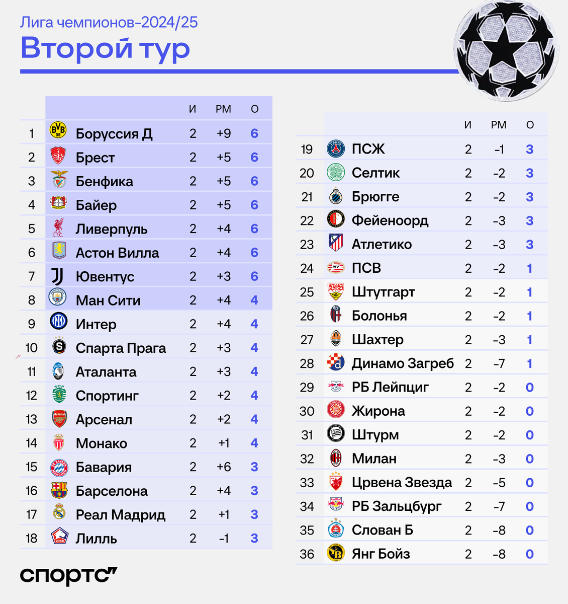 Изучаем. Закончился второй тур общего этапа Лиги чемпионов. Время рассматривать таблицу. ● 7 команд с максимальным результатом – 6 очков за 2 тура. Это «Дортмунд», «Брест», «Бенфика», «Байер», «Ливерпуль», «Астон Вилла» и «Ювентус». «Брест» шокирует. Позади 2:1 против «Штурма» и 4:0 с «Зальцбургом» – австрийцы настрадались. «Астон Вилла» одолела «Баварию» 1:0. Это первое поражение Венсана Компани в новом клубе. «Бенфика» вовсе разгромила «Атлетико» 4:0. ● Еще в верхней половине таблицы неожиданно сверкает пражская «Спарта» – 4 очка. «Спарта» разгромила «Зальцбург» 3:0 и удержала ничью против «Штутгарта» 1:1. ● 8 команд с нулем очков: «Янг Бойз», «Слован», «Зальцбург», «Црвена Звезда», «Милан», «Штурм», «Жирона» и «Лейпциг». «Милан» выделяется: 1:3 против «Ливерпуля» и 0:1 с «Байером». Впереди «Брюгге» (дома), «Реал» (в гостях), «Слован» (в гостях), «Црвена Звезда (дома), «Жирона» (дома) и «Динамо» Загреб (в гостях). «Лейпциг» тоже: 1:2 с «Атлетико», 2:3 с «Ювентусом». Сначала упустили