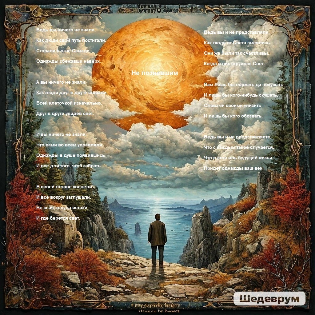 Не познавшим Ведь вы ничего не знали, Как люди свой путь постигали. Сгорали в огне Самади, Однажды сбежавши наверх. А вы ничего не знали, Как люди друг в друге сгорали, Всей клеточкой изначально, Друг в друге увидев свет. И вы ничего не знали, Что вами во всем управляли, Однажды в душе появившись И все для того, чтоб забрать… В своей голове звенели И все вокруг заглушали, Не зная, откуда истоки И где берется свет. Ведь вы и не представляли, Как люди от Света смеялись. Они же были так счастливы, Когда в них струился Свет. Вам лишь бы поржать да покушать И лишь бы кого-нибудь скушать, Словами своими унизить И лишь бы кого обозвать. Ведь вы и не представляете, Что с каждым такое случается, Что в этой иль будущей жизни, Придет однажды ваш век.