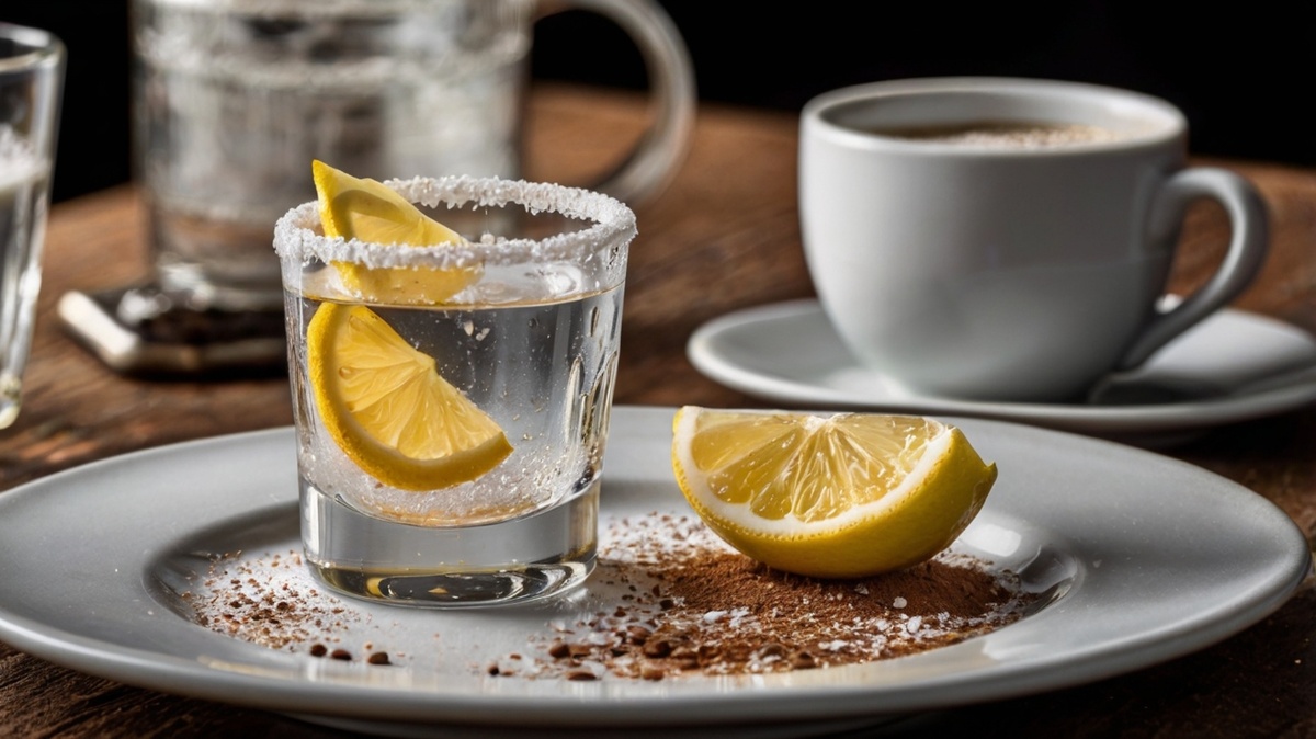 1. Для начала в рюмку вливается самогон. Сверху на него аккуратно кладется кружочек лимона. Лимон не должен полностью погрузиться в напиток.