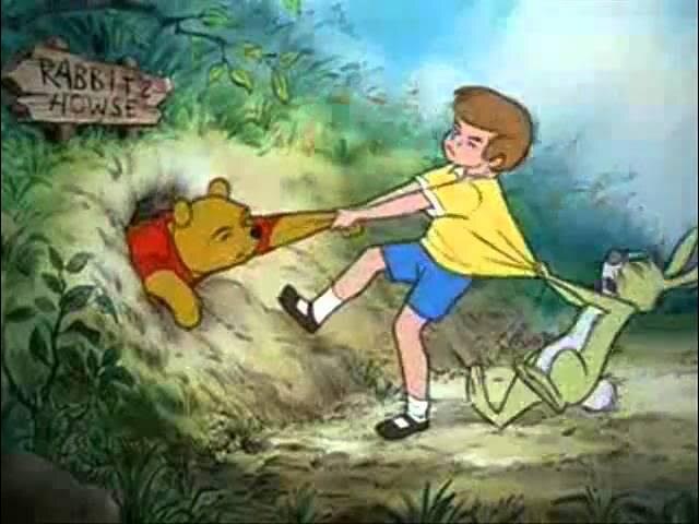 Осознав, что момент настал, Кристофер Робин взял за лапки Винни-Пуха и стал тянуть его наружу, ему помогали Кролик с его друзьями и родственниками. Через долгое время Пух издал звук и как пробка из бутылки вылетел из норы. Он встал как ни в чем не бывало, поклонился и, поблагодарив своих спасителей, пошёл дальше гулять по Лесу, напевая свои бубнилки. Другими словами, Пух не забыл о своих делах, даже попав в оказию. Жизнь никогда не останавливается на месте, нужно стараться быть в её потоке и при всех трудностях не забывать доделывать свои дела. Блж. Августин учил, что "все прошлое вытеснено будущим, все будущее следует за прошлым, и все прошлое и будущее создано Тем, Кто всегда пребывает, и от Него исходит (Conf., XI, 13). "...Настоящее оказывается временем только потому, что оно уходит в прошлое" (Conf., XI, 17). Мы проживаем лишь краткий миг настоящего, и вот оно уже стало нашим прошлым. В новое, наступившее настоящее мы можем взять лишь приобретенный опыт и ожидать, что в будущем