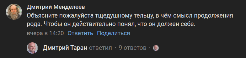 Некто под псевдонимом Дмитрий Менделеев задал вопрос, на который точно стоит ответить. Но прежде чем говорить, зачем тщедушному тельцу продолжение рода, нужно сначала ответить а почему у тщедушного тельца возникает такой вопрос.