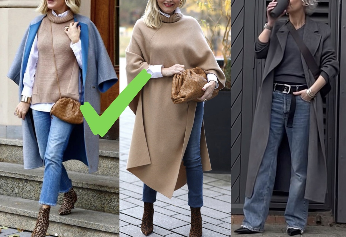 Здесь уже более широкие плотные джинсы в сочетании с замшевыми клогами - обувью, актуальность которой, я уверена, вы уже подметили. Альтернатива такой обуви на холодное время - низкие угги. Эффект тот же, эстетика та же, но теплее, конечно. Замшевый плащ оставляем на весну и осень, а зимой заменяем его на пуховик и пальто.