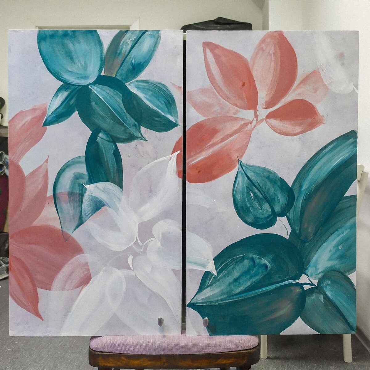 - На подготовленном фоне Анастасия рисовала меловыми красками Aturi Design, подбирая оттенки и используя акварельную технику. Краски разводились водой прямо на поверхности для создания эффекта прозрачности, что добавило рисунку глубину иа изящество.