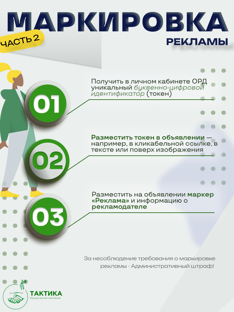 ЧТО НУЖНО ЗНАТЬ БИЗНЕСУ ❓(часть 2). Закон о маркировке рекламы должен соблюдаться всеми распространителями рекламы в интернете. Какие действия требуются для этого? 🤷 ☝️Четыре пошаговых действия физического лица (распространителя рекламы): Получить в личном кабинете ОРД уникальный буквенно-цифровой идентификатор (токен): Разместить токен в объявлении — например, в кликабельной ссылке, в тексте или поверх изображения; Разместить на объявлении маркер «Реклама» и информацию о рекламодателе. Какие штрафы за отсутствие маркировки рекламы? 🤷 За несоблюдение требования о маркировке рекламы - Административный штраф (❌ нет отметки “реклама”, НЕ размещен идентификатор) ❗Если нет пометки “реклама” и указания на рекламодателя, то штраф 👇 для физлица - штраф от 2000 до 2500 тыс. руб. ❗Если распространять рекламу в интернете без токена или неправильно разместить его в объявлении, то штраф 👇 для физлица - от 30 000 до 100 000 руб. Если НЕ хотите, чтобы Вас оштрафовали, то приходите на консультаци