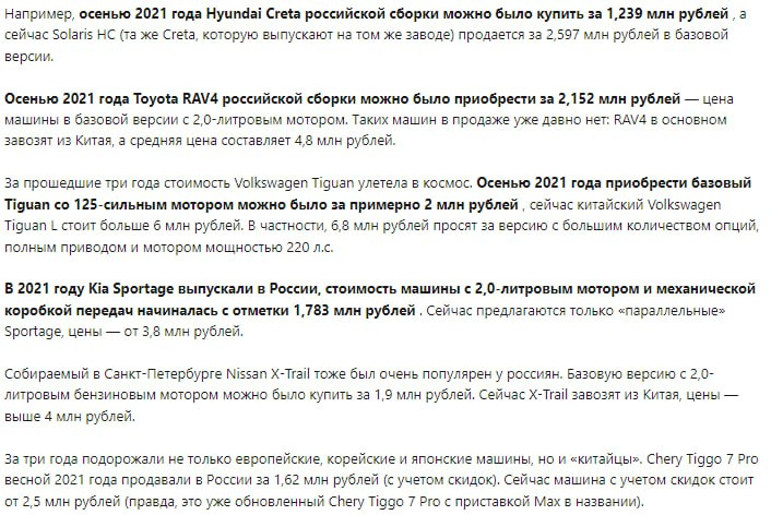 Всем привет! Автомобили в нашей стране за последние пару лет удвоились в цене, вот, для примера такая есть выдержка, да и сами вы прекрасно видите, что ценны только растут. Снижение цен на авто было всего один раз за последние 20 лет - летом 22-года, когда из-за СВО и санкций нарушился торговый баланс и экспорт сильно превышал импорт, тогда доллар стал по 60 рублей, а риски были, как никогда высоки. Низкие цены продержались около месяца, потом из-за огромного потока машин стали по цепочке поднимать цены японцы на аукционах (и корейцы на своих площадках), судоходные компании на фрахт, таможенные брокеры на свои услуги, подорожал ГЛОНАСС, транспортные компании удвоили цены на перевозку по РФ. Уже осенью цены вернулись к обычным значениям, а зимой 22-23 пошли выше, с тех пор так и не останавливаясь лишь иногда замедляя темп. Масло в огонь подливает и наше правительство, которое "заботливо" удвоило утильсбор с 1 октября 24 года. Из-за чего автомобили в наличии станут дороже от 300 тысяч д