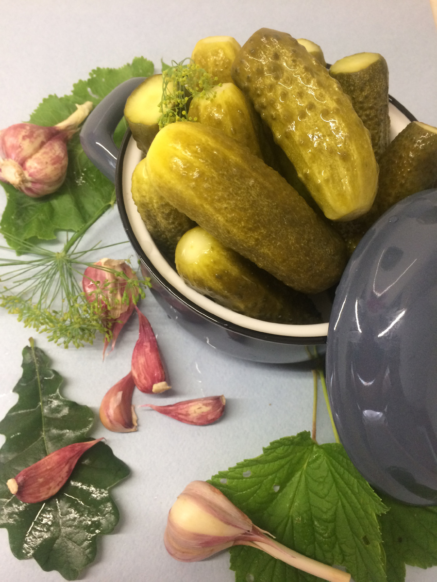 Огурцы промыть и отрезать кончики с обеих сторон. Взять банку, на дно уложить по паре листиков смородины, вишни, дуба, 2-3 зуб. чеснока и цветы укропа. Плотно очень уложить огурцы. Взять чистую кипяченую охлажденную воду, на 1 литр воды 3 ч. л. розовой соли. И залить огурцы, полностью покрыв жидкостью. Открытую банку оставить на три дня. На поверхности появятся пузырьки и пена, ее убрать. Через три дня огурцы готовы, убрать в холодильник. Огурцы должны сохранить свою плотность и быть хрустящими.