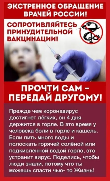 В соцсетях тиражируется спам-картинка, в которой утверждается, что коронавирус якобы держится в горле четыре дня, прежде чем достигнет легких. Якобы поэтому, чтобы вылечить болезнь, необходимо полоскать горло водой с растворенной солью. В действительности информация неверна. Коронавирус не держится в горле четыре дня, а полоскание горла солевым раствором — это не метод лечения COVID-19. Роскачество еще в 2020 также опровергло эффективность полоскания соленой или подкисленной водой для лечения коронавируса. Медики также заявили о неэффективности этой меры. «Коронавирус ничуть не страшнее, чем другие вирусы. Я бы не рекомендовал создавать панику. <…> Нет, [нельзя избавиться от коронавируса с помощью полоскания горла]», — объяснил доктор медицинских наук, специалист в области эпидемиологии и медицинской статистики Игорь Гундаров. Фейк о том, что простое полоскание горла соленой или подкисленной водой может вылечить коронавирус, муссируется в сети с начала пандемии 2020 года. Но если бы вс