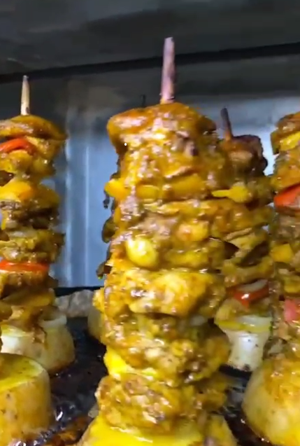 Сочная курица на шпажках в духовке Рецепт находка! Нам понадобятся продукты: 2 куриных бедра, 1 филе куриной грудки, 1 цукини, 4 болгарских перца, 3 клубня картофеля, 1 головка лука, 2 небольших помидора, Для маринада: 0.5 стакана. кефира, 1 ч.л.горчицы, 1 ч.л.соли, 1 ч.л.паприка, 0.5 ч.л.черного молотого перца, 2 щепотки прованских трав, 0.5 ч.л.хмели-сунели, зелень укропа Приготовление: 1. Нарезаем филе курицы и бедра небольшими кусочками. Картофель промываем, высушиваем и нарезаем толстыми кружочками, примерно 2 см., сладкий перец, крупными квадратами, лук кольцами. 2. Складываем куриное мясо в миску, солим, перчим, добавляем паприку, хмели сунели, прованские травы, горчицу и все заливаем кефиром, тщательно перемешиваем. Накрываем миску пищевой пленкой и оставляем курицу мариноваться 30 минут. 3. Заранее замачиваем в холодной воде деревянные шпажки. Берем картофель втыкаем в него шпажки. Затем нанизываем чередуя курицу и овощи. Отправляем в разогретую духовку до 180 С и готовим