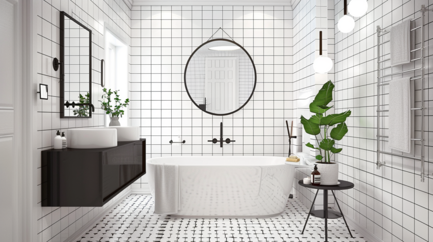 Если в санузле достаточно места, а вы готовы чуть чаще убираться, отдельно стоящая ванна станет выигрышным акцентом в стиле санузла.