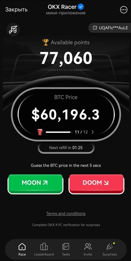 Добрый день, криптоинтузиасты! Для тех, кто еще не в теме, напоминаю про мини-приложение в Telegram - игру «OKX Racer». Смысл игры - угадать, поднимется или упадет цена биткоина в ближайшие пять секунд. Успешные предсказания приносят очки, а серия побед — множители, которые увеличивают их количество. Игроки могут приглашать своих друзей и выполнять различные задания. За счет этой игры биржа получит много новых регистраций, а в будущем и клиентов биржи, так как Аirdrop будет выводиться на их биржу. Обычно биржи платят солидные деньги за привлечение новых юзеров, поэтому можно предположить, что заработаем хорошо! Новых клиентов биржа ОKX поощряет подарками и бонусами. Ссылка для регистрации на бирже OKX. To be continued… Понравился контент? Не скупись, накидай лютому лайков! И на тележку подписаться не забудь! Telegram-канал Криптонажива. Подписаться.