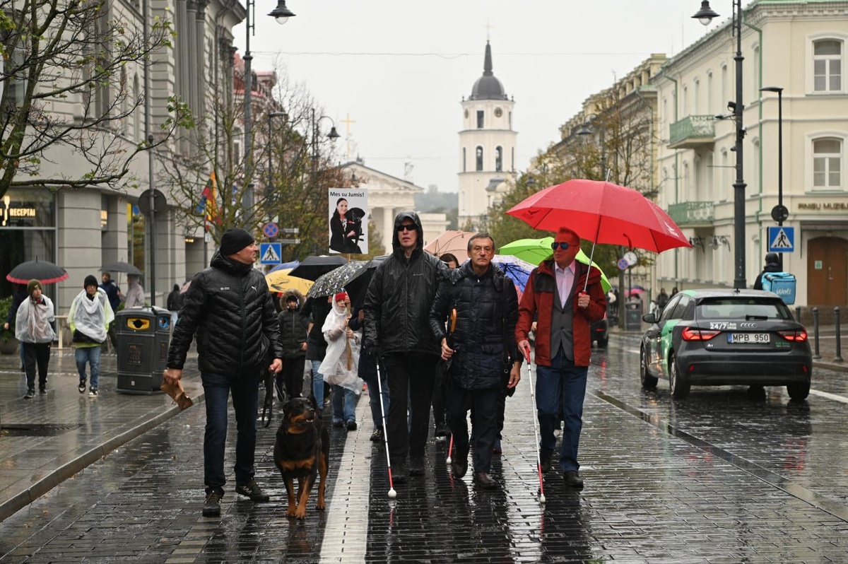 Шествие Союза слепых и слабовидящих началось на Кафедральной площади в Вильнюсе и продолжилось у здания правительства. Участники требовали, чтобы слепым предоставили возможность пользоваться помощью собаки-поводыря. Они держали флаги союза, плакат в поддержку общества слепых с надписью "Мы с вами". По словам президента организации Паулюса Калвялиса, цель – напомнить обществу о проблемах, с которыми каждый день сталкиваются люди с нарушениями зрения. Власти, говорит Калвялис, должны обязательно рассмотреть вопрос о том, чтобы каждый человек с такими ограничениями смог получить собаку-поводыря.