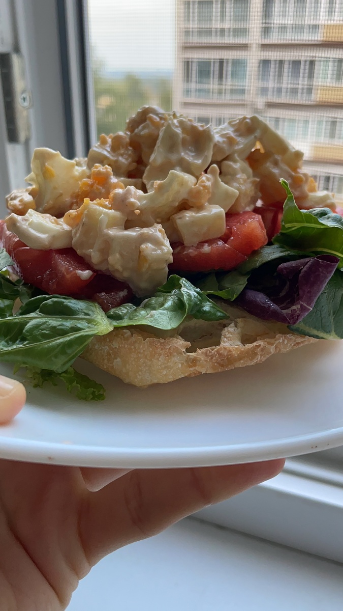 Бутерброд - быстрый вариант завтрака, как я думаю. Тем более его можно собрать из всего чего угодно, рамки вашей фантазии тут не ограничены (даже хлеб не обязательный ингредиент, но я конечно предпочитаю с ним). И так, сегодня у меня была чиабатта с яичным салатом. Для салата я взяла яйца, сыр (у меня был пармезан) и соус цезарь (можно взять майонез, сметану, йогурт...), еще можно добавить чеснок, но я подумала утором как-то не в тему))). Дальше: яйцо отварить, все порезать или потереть на терке и смазать соусом, добавить специи по вкусу. Собираем наш бутер. Чиабатту подсушить на сухой сковороде, выложить зелень, порезанный помидор и собственно яичный салат. Готово!