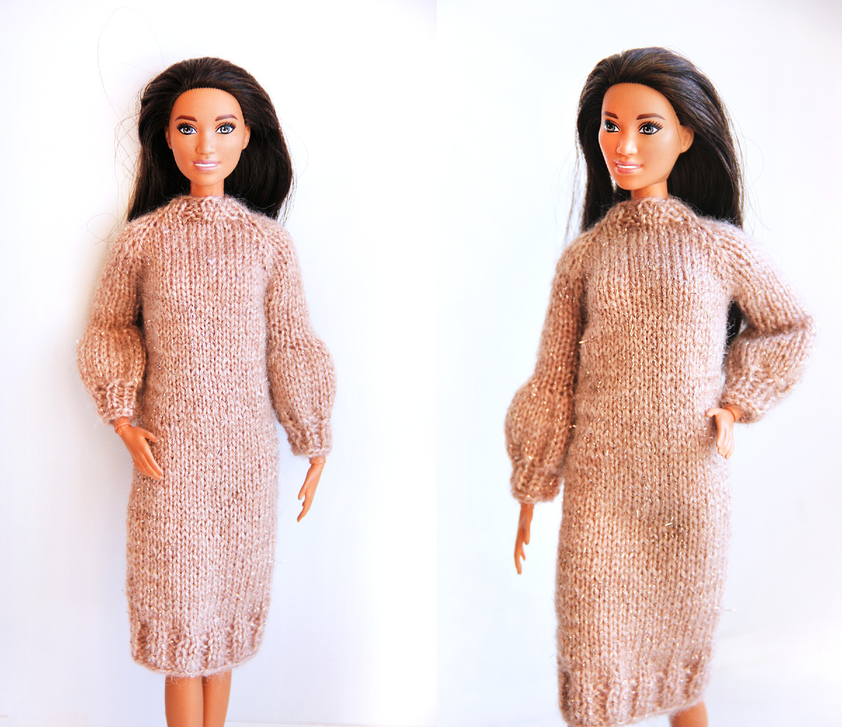 Платье связано сверху вниз с регланом. Сзади сверху застежка-кнопка. Удобнее всего оказалось надевать через верх.