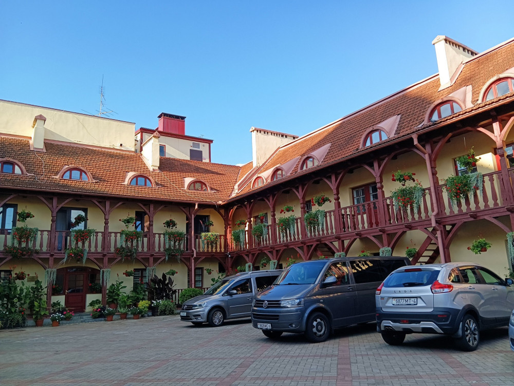 Одна из маст_си достопримечательностей старого города — дворы. Вот этот самый знаменитый, посетить его советуют все путеводители :) Это внутренний двор иезуитского коллегиума, примыкает он к костелу Св. Францишка Ксаверия И одна часть дворика об этом напоминает а вот вторая часть зданий принадлежит какой-то прокуратуре, поэтому по выходным там может быть закрыто, внимание! Вообще, вся улица Карла Маркса на которой и расположен вход во дворик, состоит из двухэтажных домов, поэтому закоулков там хватает :) Ищите арки и входите смело! Покажу заодно квартиру, в которой мы жили — она тоже тут совсем рядом. Сворачиваем на крошечную Городничанскую Она узкая, потому что в XVI веке на разворот пикапа тут не рассчитывали :) То есть ехать по ней можно, но очень аккуратно! Наши окна на первом этаже Двор вот такой, места вроде много, но машины стоят очень плотно. Дима ругался, что не в отеле с нормальной стоянкой. А я люблю такое — в самом центре! Квартира нам очень понравилась, явно переделывалась