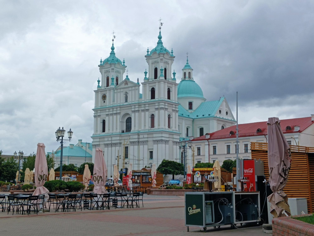 Снова летний прекрасный Гродно и первый день отпуска. Гуляли весь день под тучами, в какой-то момент даже пришлось открыть зонт — первый и последний раз за весь отпуск :) Про костел Св. Францишка Ксаверия я уже рассказывала. Жили мы в 3-х минутах ходьбы за ним и через центральную, Советскую, площадь Гродно прошли за три дня раз 20 туда и обратно Рядом с ней — все основные достопримечательности города. Вот например шикарнейший Драмтеатр Танк Т-34 на постаменте в центре круговой развязки напротив костела Обретения Святого Креста Новое здание театра было построено в 1984 году, к сожалению, на месте гродненского монастыря бернардинок. Архитектор Г. Мачульский! В театре зрительный зал с амфитетаром и балконом на 700 мест, вестибюлем и фойе и административный корпус с малым зрительным залом на 216 мест на первом этаже. В цокольном этаже репетиционный зал, актёрские комнаты, аппаратная, склад декораций. У входа в театр ― трёхфигурная скульптурная композиция скульптора Л. Зильбера. Пишут, что