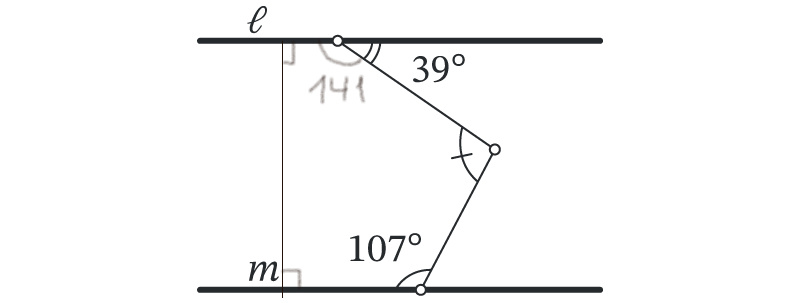 Прямые ℓ и m параллельны. Найдите величину угла, отмеченного дужкой с чёрточкой. Достраиваем эту штуку до пятиугольника. Вспоминаем, что сумма углов многоугольника 180*(n-1), значит в нашем случае 180*4=540 540-90-90-141-107= 112 Ответ: 112 Другие задачи раздела