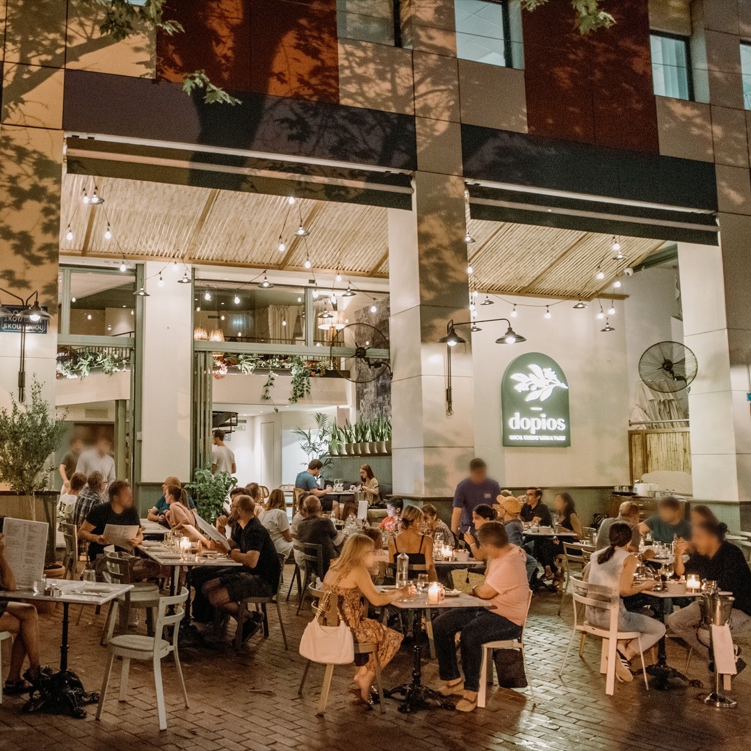 Dopios предлагает классические блюда греческой таверны мезе, дополненные элементами анатолийской и японской кухни. Специально переработанные традиционные блюда, предложенные Peskias, готовятся шеф-поваром Димитрисом Малисом, который использует высококачественные свежие ингредиенты. Примерами служат тирокафтери, классический острый сырный соус, который в Dopios подается в виде сырного крема с вишней, а также дзадзики с авокадо, сочетающий классический соус из чеснока и йогурта с авокадо для более маслянистой текстуры и более насыщенного вкуса. Картофельный салат «Мани» с апельсином, авокадо, оливками и зеленым луком — еще одно особое блюдо, сочетающее в себе освежающие вкусы.