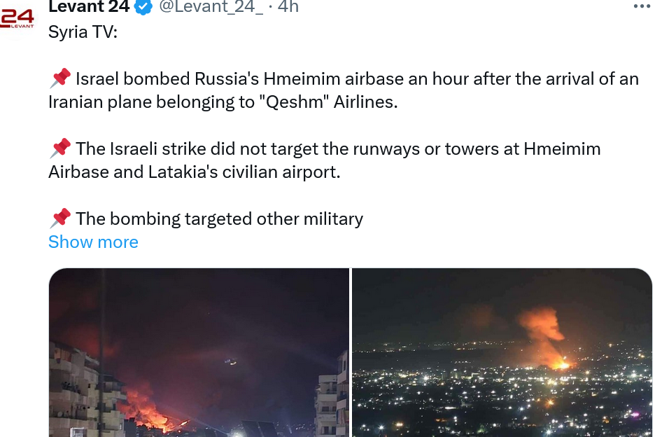 Вчера днём целый ряд арабских СМИ вышли с истеричными заголовками о том, что израильтяне совсем слетели с катушек и нанесли воздушный удар по российской ключевой авиабазе "Хмеймим" в Сирии. Если это действительно было бы так, то означало бы, что все тайные договоренности с израильским руководством о нейтралитете и обоюдной неприкосновенности, регулярно сбоившие, но всё же державшиеся, оказались перечёркнуты. Обращало на себя внимание очевидное отсутствие выгоды для Израиля в приобретении в этот напряженный момент столь могущественного врага. До этого обеим сторонам удавалось поддерживать довольно хрупкий военный баланс, показательно не применяя агрессивную риторику друг против друга на официальном уровне. Именно поэтому мы немного подождали нести арабскую сенсацию в массы. Там вообще любят всякие гиперболы и пустое гоняние воздуха. Да и канал Сирия-ТВ, первым сообщивший эту "резонансную новость", оказался сливным бачком турецких спецслужб, базирующимся в Стамбуле. Но слово было сказано и событие стало обрастать фантастическими подробностями и жить на страницах многих изданий самостоятельной жизнью. И только к позднему вечеру картина прояснилась ровно настолько, что можно было сделать хоть какие-то первые неочевидные выводы.