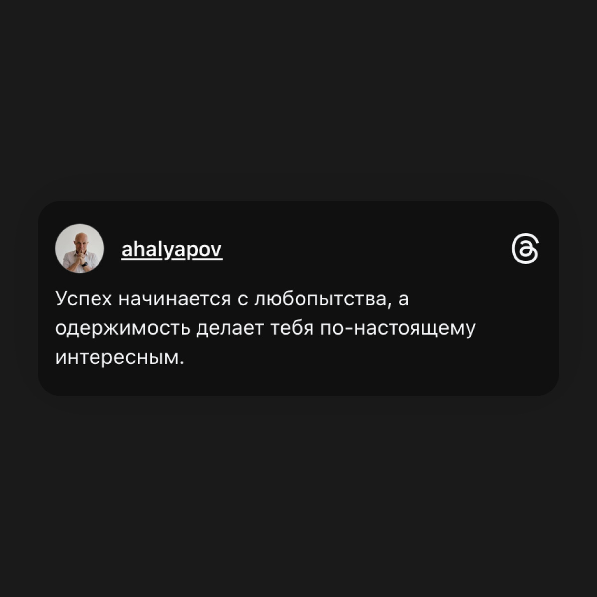 Можно стать "экспертом" за две недели в любой теме. Но только на словах. Да, ты сможешь красиво говорить и писать об этом, но это не сделает тебя настоящим профессионалом. Есть два типа людей: 1. Те, кто умеют говорить о чём-то. 2. Те, кто действительно знают тему. Твоя цель — стать вторым типом хотя бы в нескольких областях. И проводить время с теми, кто тоже в этом разбирается. Особенно в темах, где ты ещё новичок. Успех начинается с любопытства. Большинство людей слишком заняты тем, чтобы казаться интересными, но не задаются вопросом, что их по-настоящему увлекает. Когда ты уже не можешь остановиться, твоё любопытство превращается в одержимость. Именно одержимость делает тебя по-настоящему интересным. А люди из первого типа, как мыльные пузыри: издалека кажутся яркими, но при ближайшем рассмотрении — лопаются. Как думаешь, кто ты — 1 или 2 тип? А для тебя я из кого типа? Пиши в комментариях!
