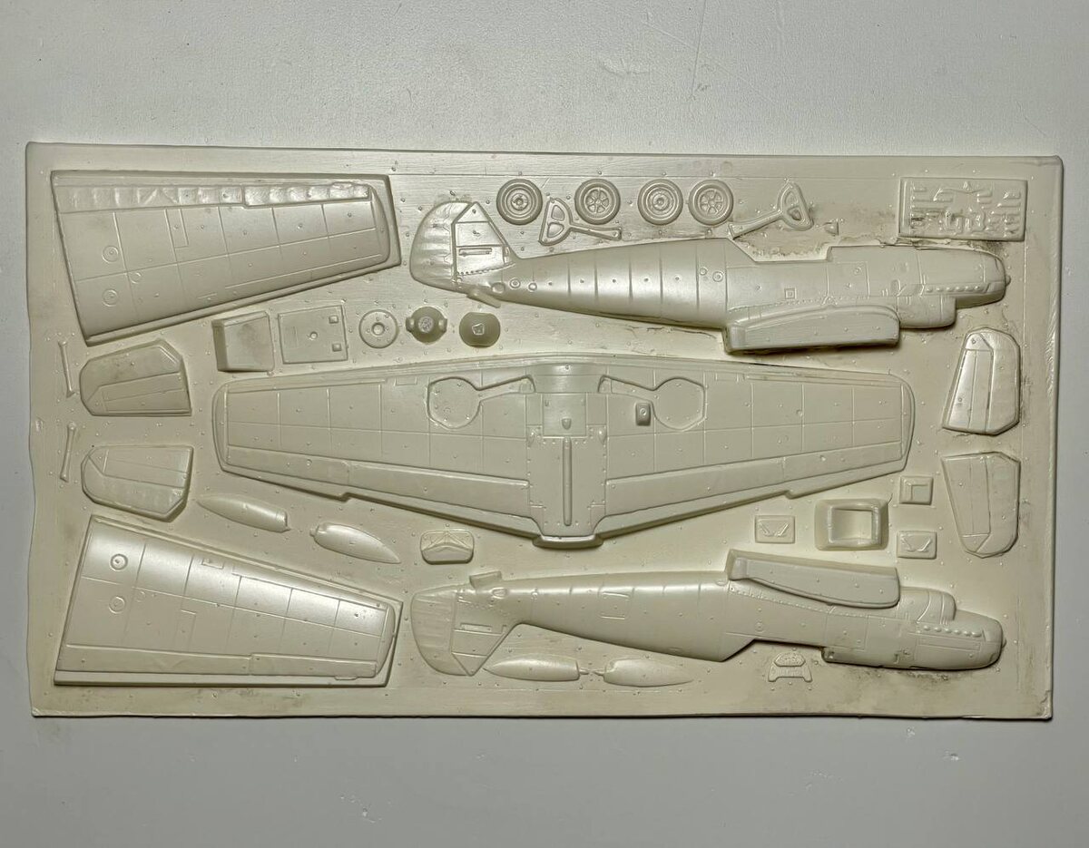 Мой выбор пал на немецкий "Мессер", поскольку сама по себе модель небольшая (масштаб классический - 72-й), да и деталей у него немного. Вся модель расположена на небольшой (где-то 15*20см) плате из пластика цвета слоновой кости (не удивлюсь, если когда-то он был белым). Однако, в наборе имеется всё необходимое, включая интерьер. Толщина пластика более-менее приемлемая, но на первый взгляд материал выглядит хрупковатым и, видимо, потребует аккуратного обращения.