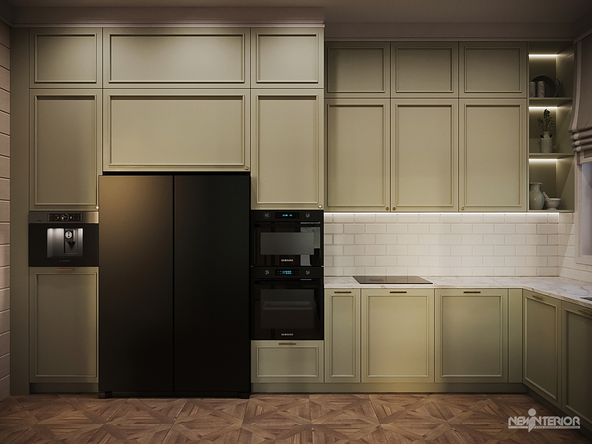 Давайте вернёмся в интерьер загородного дома, расположенного в Тверской области. Кухню мы решили сделать в оливковом цвете.