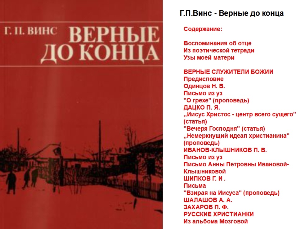 Гонения, тюрьмы и ссылки за веру стали для христиан России традицией. На этих страницах помещены воспоминания о моем отце - Винс Петре Яковлевиче проповеднике Евангелия 30-х годов в Сибири и на Дальнем Востоке, физически уничтоженном в 1943 году в одном из лагерей Магадана. В разделе ,,Из поэтической тетради" помещены в хронологической по