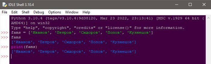 Кстати, почему мы обратились к третьему элементу списка fams[3], ведь Попов – это четвертый по счету элемент массива? Все верно, четвертый. Но, напомним, индексация в массивах начинается с нуля. Поэтому, если Иванов имеет индекс 0, то Попов – как раз 3.