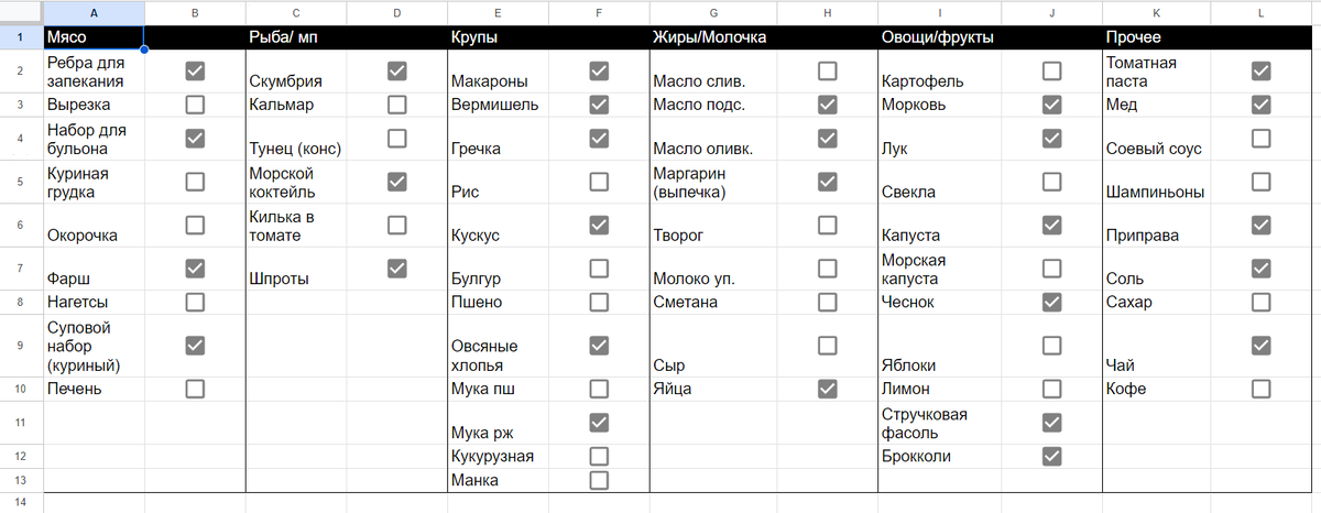 Для комфортной жизни нам нужны две вещи: еда и деньги. Я довольно импульсивный человек и раньше любой поход в магазин для меня заканчивался покупкой ненужных вещей. Сейчас мне удается грамотно распоряжаться семейным бюджетом, да так, что удается откладывать деньги на покупку квартиры. Еще год назад мы с мужем решили навести порядок в холодильнике, а заодно и в собственном желудке. В эксель-таблице составили список продуктов, необходимых нам для комфорта. Список поделен на графы: «мясо», «рыба и морепродукты», «крупы», «жиры» и пр. В каждой расписаны продукты из категории и проставлены галочки – есть они в данный момент или закончились. Домашнюю инвентаризацию провожу дважды в месяц, каждые две недели. Проставляю галочки, если чего-то не хватает и выписывают название продукта в заметки на телефоне. В магазине следую представленного списка и беру только ту еду, что там есть. Даже если захотелось отступить от списка, у меня это вряд ли выйдет. Почему? Расскажу во втором пункте. Цены в маг