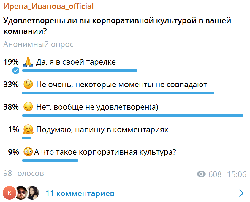 ✅ Мы с вами обсудили насколько важно подписывая документы плотно и внимательно знакомиться с ними. Почему это может уберечь вас от ошибок. ✅ Мы узнали, как определить, что работа станет любимой и что влияет на то, чтобы работа стала нелюбимой? ✅ Мы поговорили о том, почему люди зачастую пытаются переложить ответственность на других для того, чтобы снять её с себя и не отягощать себя в случае неудачи. ✅ Мы выяснили, работает ли хх.ру и почему соискатели зачастую считают размещение резюме на этой платформе бесполезным. А уж ТОП соискатели вообще моветоном. Мы поучаствовали в опросе удовлетворены ли мои читатели корпоративной культурой компании, где работают. Оказалось, что большинство либо вообще не удовлетворены корпоративной культурой своей организации, либо не очень удовлетворены. А еще, мы узнали легко ли моим читателям брать на себя ответственность. Большинство моих читателей считают, что да, легко, поэтому они сами управляют своей жизнью. Но некоторые считают, что не очень