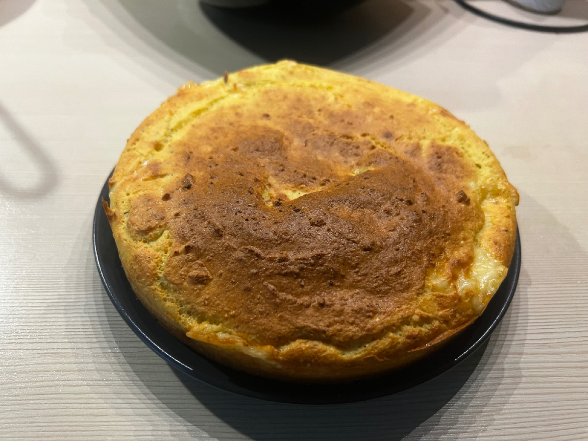 Сегодня не сладкая выпечка из творога, хорошо подходит на завтрак. Тесто хорошо поднимается за счет разрыхлителя. Ингредиенты: *чем больше сыра, тем вкуснее и тем больше калорийность и жирность. Приготовление: Смешиваем: мука + яйца + йогурт + творог + разрыхлитель + специи. Я добавляла прованские травы и сухой чеснок, прованские травы уже с солью, поэтому дополнительно не солю. Творог беру пастообразный, чтобы не было крупных зерен, тогда тесто хорошо смешивается и ложкой. Выкладываем в форму половину теста, затем сыр и закрываем все второй половиной теста. Тесто сильно липнет к ложке, поэтому ложку можно смачивать водой. Убираем в заранее разогретую духовку до 180 С на 25 минут. Получается пористый и воздушный, в объеме не падает после духовки. На завтрак я беру четверть пирог и добавляю пастрому и слабосоленую форель. Получается сытно и достаточно белков.