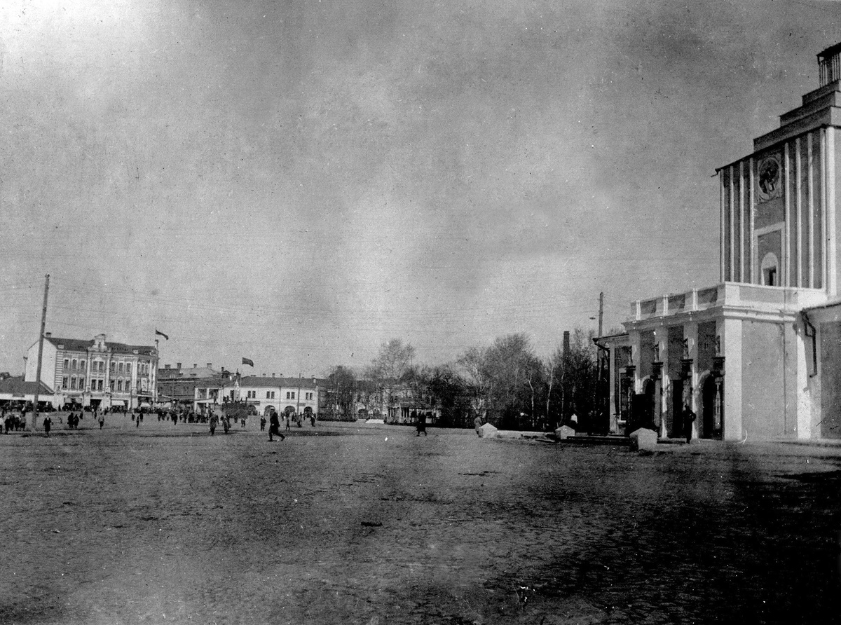 Площадь Революции, 1940-е Уже прошло более 10 лет, как были снесены Афанасьевская церковь и церковь Николая Чудотворца на Сенной, а площадь всё ещё пустое пространство, которое благоустроят только в 1950-е. Тогда же появится и тот знаменитый фонтан с фигурами тружеников страны Советов. Здание же бывшего Спасо-Всеградского собора на снимке справа уже довольно сильно перестроено и внешне напоминает зиккурат, где к тому времени активно функционировал кинозал.