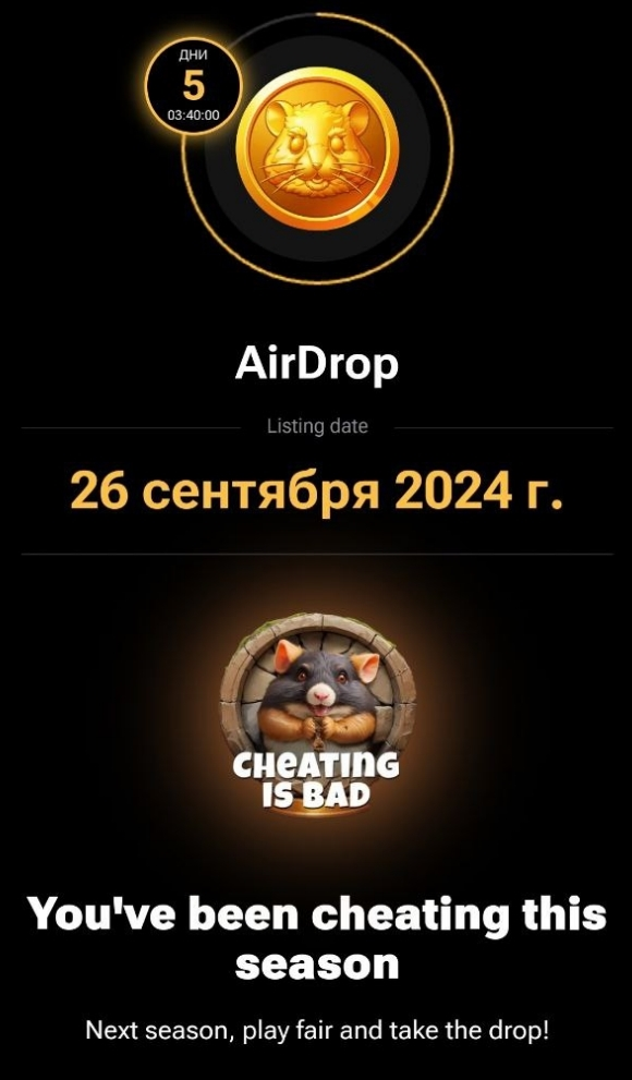 Многие задаются вопросом, за что дали бан в Хамстер Комбат. В игре написано «Обманывать - это плохо. В этом сезоне вы жульничали. В следующем сезоне играйте честно и выигрывайте» Точной информации еще нет, получат дроп токенов HMSTR люди с такой ачивкой или нет, поэтому ждем пост